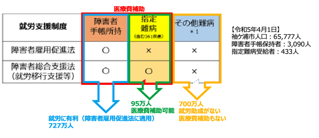 ただ現状として障がい者(障害手帳を持っている人)は障がい者雇用促進法に記してある最低雇用率(民間企業2.5%、地方自治体2.8%)で働く採用枠が設けられていますが、難病者については医療費補助などは一部受けられるものの、雇用の部分に関しては障がい者法定雇用率の中には含まれていません。その結果、難病を抱えている人は雇用の枠が担保されず働けない人が多数出てきている現状があります。