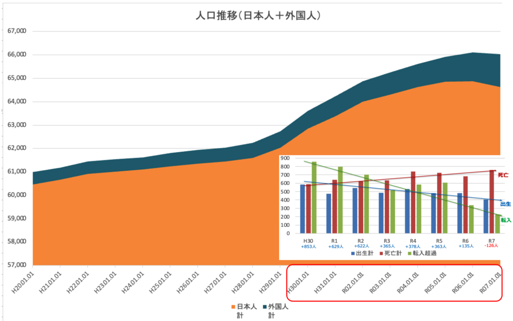 また人口数の推移ですが日本人と外国人の推移を比べると外国人は順調に伸びていますが、日本人は令和5年あたりから減り続けています。令和7年に至っては(死亡数ー出生数+転入超過数)純増減数が△126人になっています。