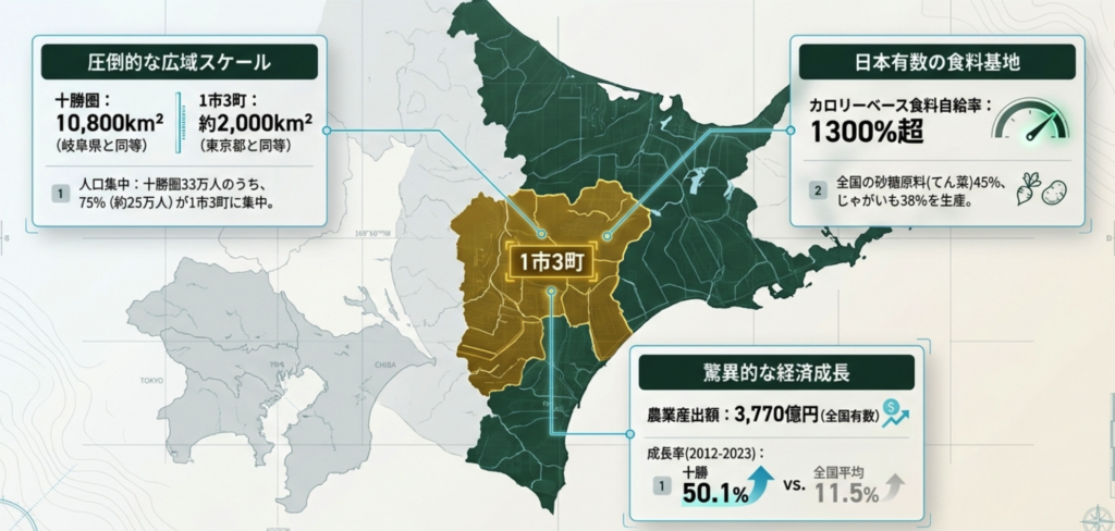 北海道・十勝平野の中央に位置する帯広市。このエリアを含む十勝19市町村の食糧自給率は、カロリーベースで実に1300%を超えます。日本の食糧基地として圧倒的なポテンシャルを誇り、農業産出額は約3,770億円(2021年)と、県単位である千葉県に匹敵する規模です。