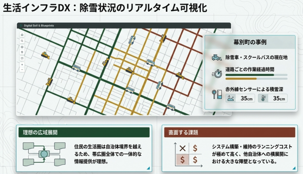 除雪・スクールバス管理の可視化:芽室町等で導入されている管理システムは、除雪車やスクールバスの現在位置をリアルタイムで公開している。これで住民は「自分の前の道路の除雪状況」を把握し、外出計画を立てることが可能となった。ただし、近隣の自治体間(例:芽室町から帯広市)への通勤・通学者が多い中、自治体ごとにシステムが分断され「コストvs広域利便性」等のジレンマも顕在化しており、今後は圏域一体でのデータ統合が課題となるとの事。※袖ケ浦市でも”チョイソコがうら”が君津中央病院に行けない等…